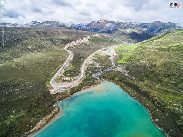 經幡飄揚在這個 五千多米的山口,周圍是連綿的山脈還有雪山。埡口的風很大,氣溫低了很多,在這里連走路都會氣喘吁吁。我們在這個海拔放飛無人機,第一次挑戰這么高的海拔,還是有點膽戰心驚的,幸好還是安全返航。廣闊的綠色草甸和延綿的318國道看著讓人心情舒暢。