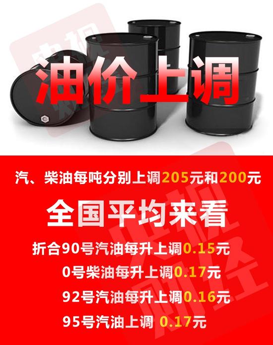 全國(guó)平均來(lái)看,折合90號(hào)汽油每升上調(diào)0.15元,92號(hào)汽油每升上調(diào)0.16元,95號(hào)上調(diào)0.17元,0號(hào)柴油每升上調(diào)0.17元。按一般家用汽車(chē)油箱50L容量估測(cè),加滿(mǎn)一箱92號(hào)汽油將多花約8塊錢(qián)。
